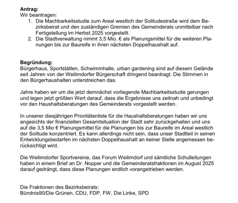 Betreff: Machbarkeitsstudie zum Areal westlich der Solitudestraße zeitnah im BBR und Gemeinderat vorstellen