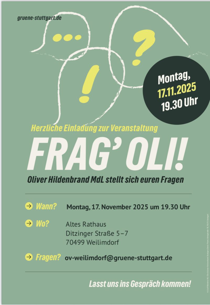 Politische Anliegen, Anregungen, Ideen oder Fragen: Alle Interessierten aus dem Stuttgarter Norden sind herzlich zur nächsten Bürger:innen-Sprechstunde von Oliver Hildenbrand eingeladen — Montag, 6. März, 13 bis 16 Uhr. „Ich freue mich auf die persönlichen Begegnungen und den unmittelbaren Austausch vor Ort“, so unser direkt gewählter GRÜNEN-Landtagsabgeordneter für den Wahlkreis Stuttgart III. Die Sprechstunde findet im Wahlkreisbüro in Weilimdorf, Glemsgaustraße 27, statt. Interessierte können vorbeikommen oder mit Oliver Hildenbrand zu ihrem Anliegen telefonieren. Zur bessere Planung bitte anmelden per Mail an Oliver.Hildenbrand@gruene.landtag-bw.de oder telefonisch (0711) 2063-6270.