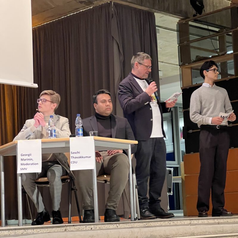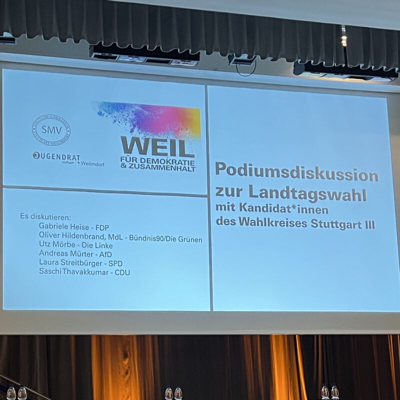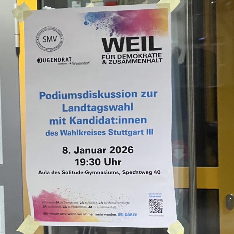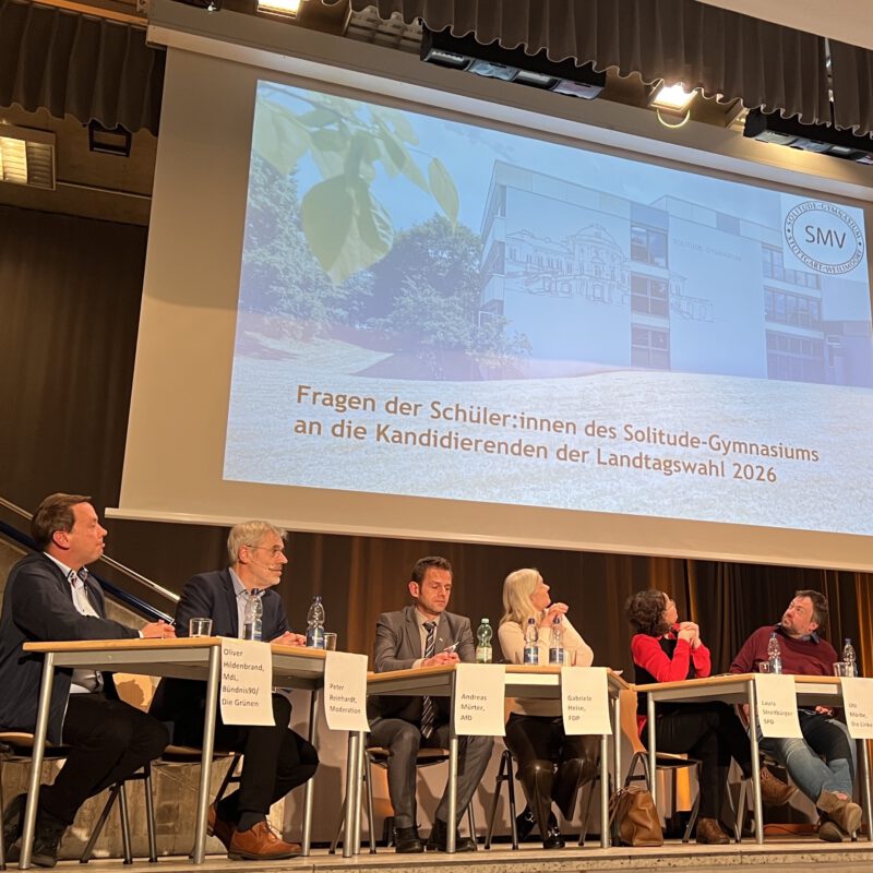 Gratulation an Oliver Hildenbrand — der Start in den Wahlkampf 2Ö26 ist mehr als gelungen! Unser Landtagsabgeordneter und erneuter Wahlkreiskandidat war bei  einer Podiumsdiskussion im Solitude-Gymnasium dabei. Veranstalter: der Verein „WEIL für Demokratie & Zusammenhalt“, der Jugendrat Stuttgart-Weilimdorf und die SMV des Solitude-Gymnasiums. Eingeladen waren die sechs Bewerber*innen im Wahlkreis Stuttgart III; Schwerpunktthemen: Bildung, Wirtschaft, LEA. Und Oliver Hildenbrand zeigte auf, was die GRÜNEN in Regierungsverantwortung im Land z. B. erreicht haben: Mit dem Startchancen-Programm und früher Sprachförderung sind wir auf dem Weg zu mehr Chancengerechtigkeit im Bildungssystem! In Sachen Wirtschaft muss die Dekarbonisierung vorangetrieben werden, Ökonomie und Klimaschutz sind kein Widerspruch, sondern gehören zusammen! Dass die LEA Befürchtungen in Weilimdorf auslöst, ist nachvollziehbar, so Oliver Hildenbrand, aber mit umfassender Information der Menschen vor Ort und einem breit angelegten Sicherheitskonzept für die Geflüchteten-Einrichtung sollten sich Ängste eindämmen lassen! Eins jedoch ist und bleibt klar: die GRÜNEN stehen zu ihrer humanitären Verantwortung!
